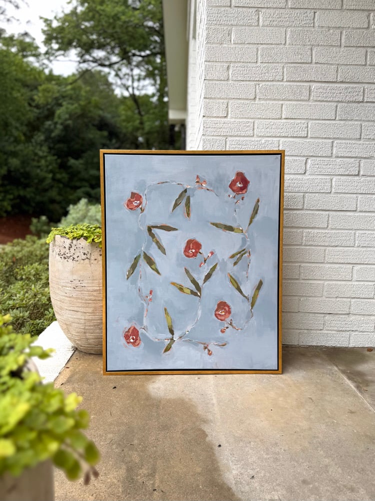 This is an original 24x30" mixed media painting on canvas from the Perennial Vine series, shown in an antique gold floater frame.